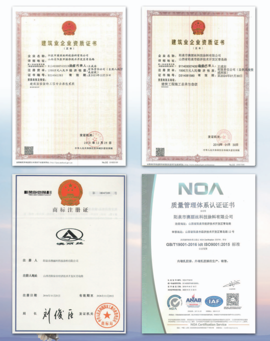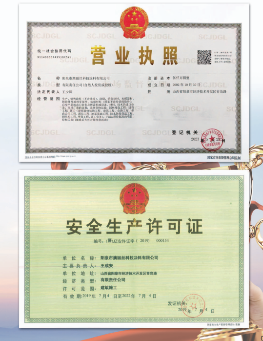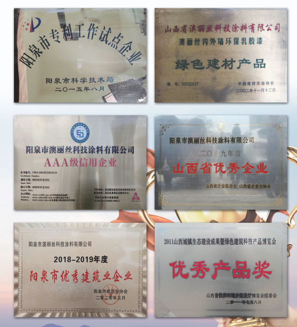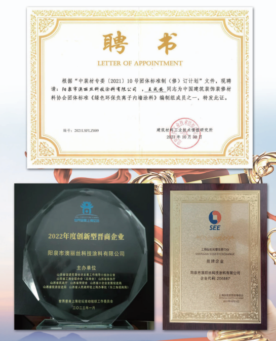 陽泉市澳麗絲科技涂料有限公司本著“建標準化管理體系、帶高標準團隊、打造民族品牌”的目標,公司規(guī)模不斷擴大,現(xiàn)已擁有高級管理人員16人,高級工程師8人,科研人員9人,工程項目經(jīng)理5人,員工260人,是一支技術力量雄厚的年輕團隊。公司先后獲得山西省“高新技術企業(yè)”、“專精特新中小企業(yè)”、榮獲“AAA信用企業(yè)”、“山西省優(yōu)秀企業(yè)”、“山西省著名商標”、山西省建設廳頒發(fā)的“優(yōu)秀產(chǎn)品獎”、山西省民營經(jīng)濟促進會副會長單位、陽泉市人民政府頒發(fā)的“重合同守信用企業(yè)”、“陽泉市優(yōu)秀建筑企業(yè)”、“陽泉市企業(yè)聯(lián)合會、陽泉市企業(yè)家協(xié)會、陽泉市工業(yè)經(jīng)濟聯(lián)合會副會長單位”,并于2023年1月獲得了由山西省促進民營經(jīng)濟發(fā)展工作組、山西省工商業(yè)聯(lián)合會、山西省商務廳、山西省民政廳、山西省貿(mào)促會、山西省小企業(yè)發(fā)展促進局、山西省投資促進局、山西省人民政府駐上海辦事處聯(lián)合主辦的世界晉商上海論壇活動組織工作委員會頒發(fā)的“2022年度創(chuàng)新型晉商企業(yè)”等多項榮譽。